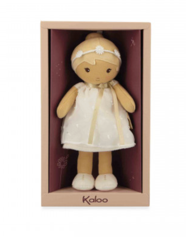 It's time to meet Daphne: a beautiful, elegant 25cm fabric doll! Suitable for babies from birth, she's part of Kaloo's Tendresse doll collection. Elegantly dressed in an ivory polka-dot organza dress, Daphne is ready to celebrate precious moments like a christening or a wedding. Her beautifully styled updo adds a touch of distinction, and her matching shoes complete her refined and elegant look. Daphne is a doll that reflects the purity and gentleness of precious moments. Her ethereal outfit is enhanced by a delicate flower crown, like a final touch of poetry. With her peaceful gaze and delicate appearance, Daphne invites gentleness and reverie. She seems to have stepped straight out of a suspended moment, where silence soothes and tender gestures comfort. She embodies those calm moments when we take the time to feel, like a light breeze caressing the skin. Incredibly soft, she's easy for little hands to grasp and quickly becomes the perfect cuddly companion. Discreet and charming, Daphné naturally becomes a part of a toddler's daily life. A small sewn-on ribbon on her back allows you to write the baby's name, making her a unique and precious friend. Presented in a pretty box, she makes an original baby gift, full of sweetness and whimsy. She's also perfect as a first doll to stimulate a child's imagination. Carefully crafted, this fabric doll is made with at least 80% recycled materials, including its recycled polyester stuffing. Machine washable at 30°C, this adorable doll is ready to be adopted and loved for years to come!