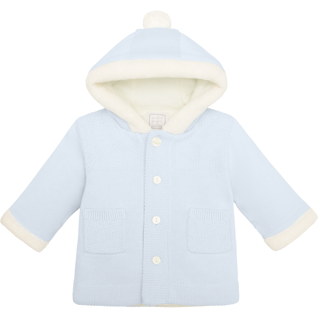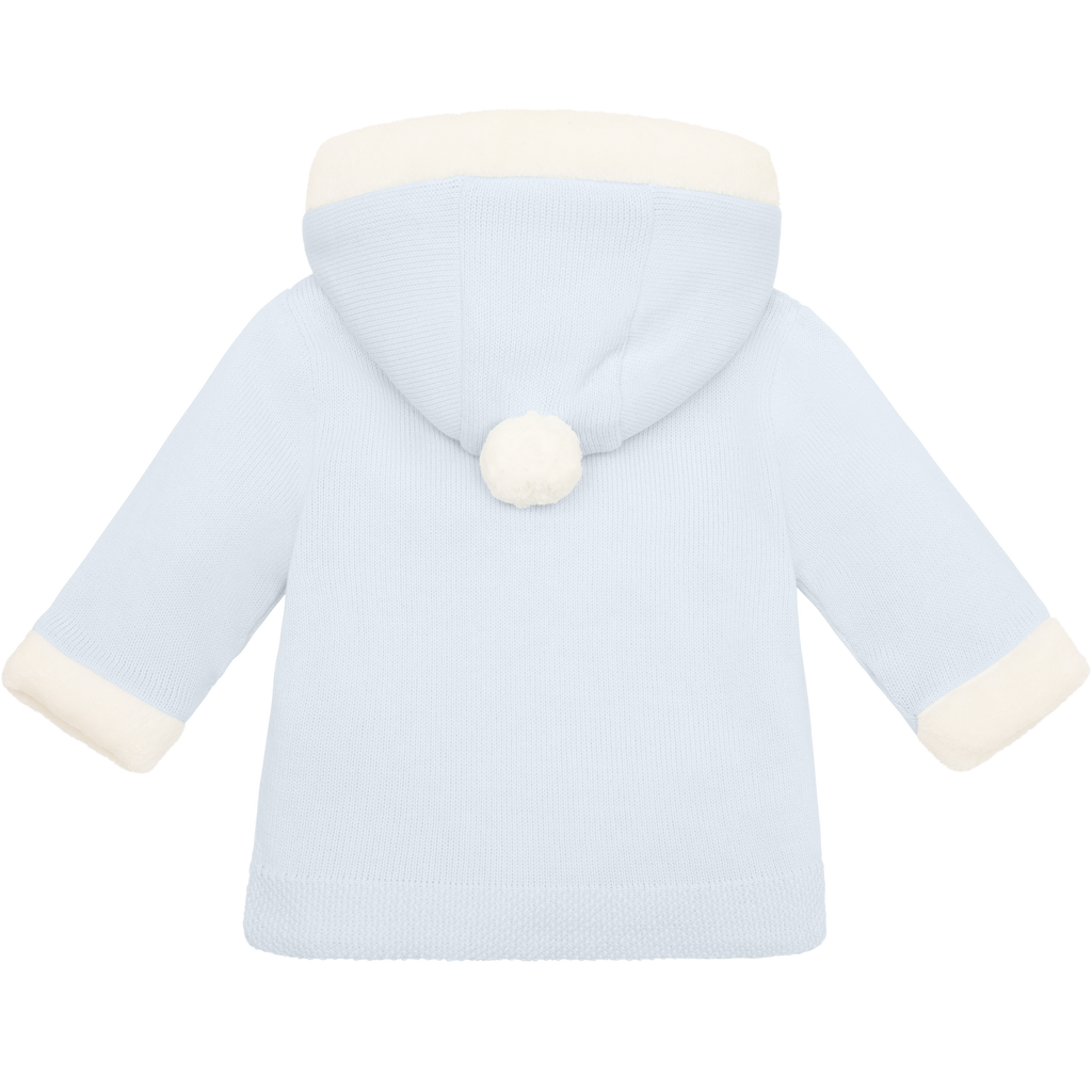This Emile Et Rose Kai Jacket combines expert craftsmanship with stylish details. Featuring a soft blue knitted fabric, it is enhanced by a cozy faux fur hood and sleeve trims, each accented with playful pom poms. Designed to provide warmth and comfort, this jacket is perfect for keeping little ones snug during cooler days while adding a charming touch to their outfit.