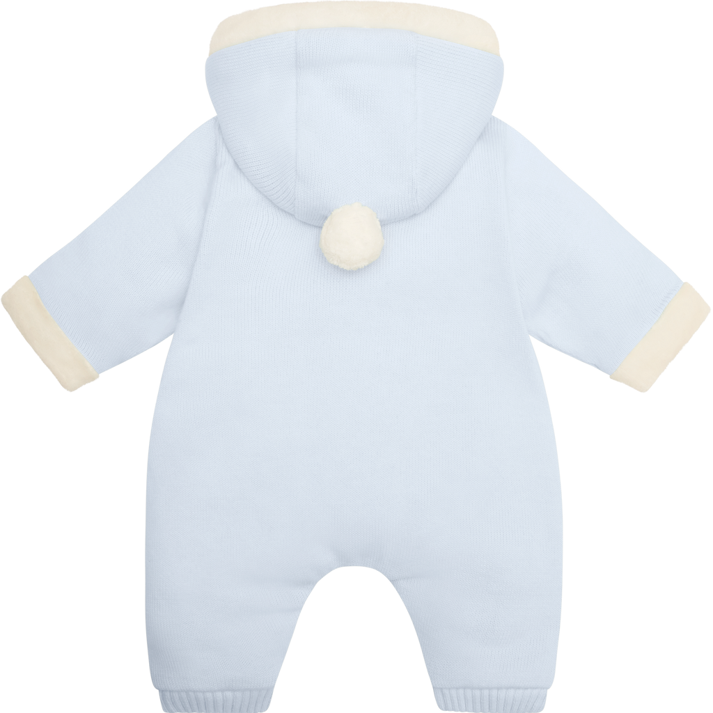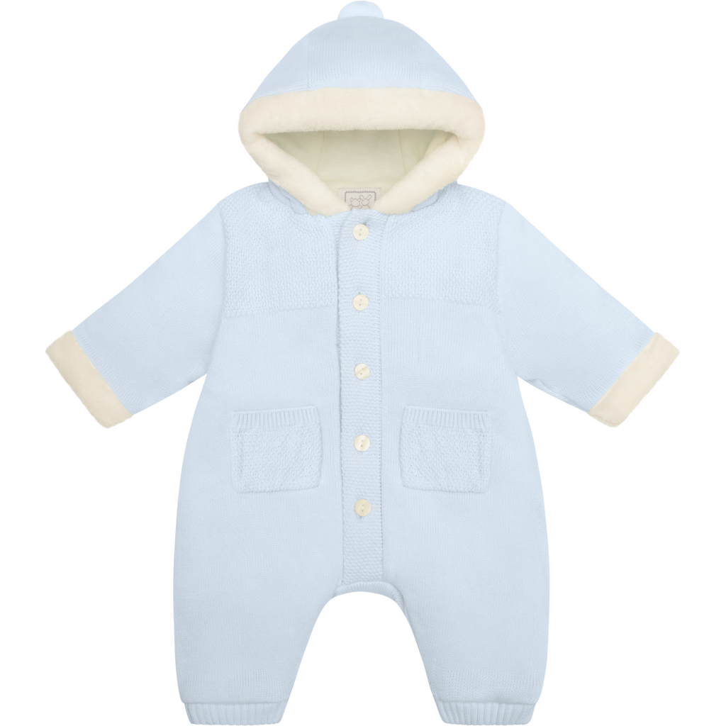 This blue knit pramsuit from Emile Et Rose combines warmth and style, featuring practical pockets and a soft faux fur trim for added comfort. The charming pom pom detail adds a playful touch, making it an ideal choice for keeping little ones cozy during chilly outings. Crafted with care, it ensures both functionality and elegance in one piece.