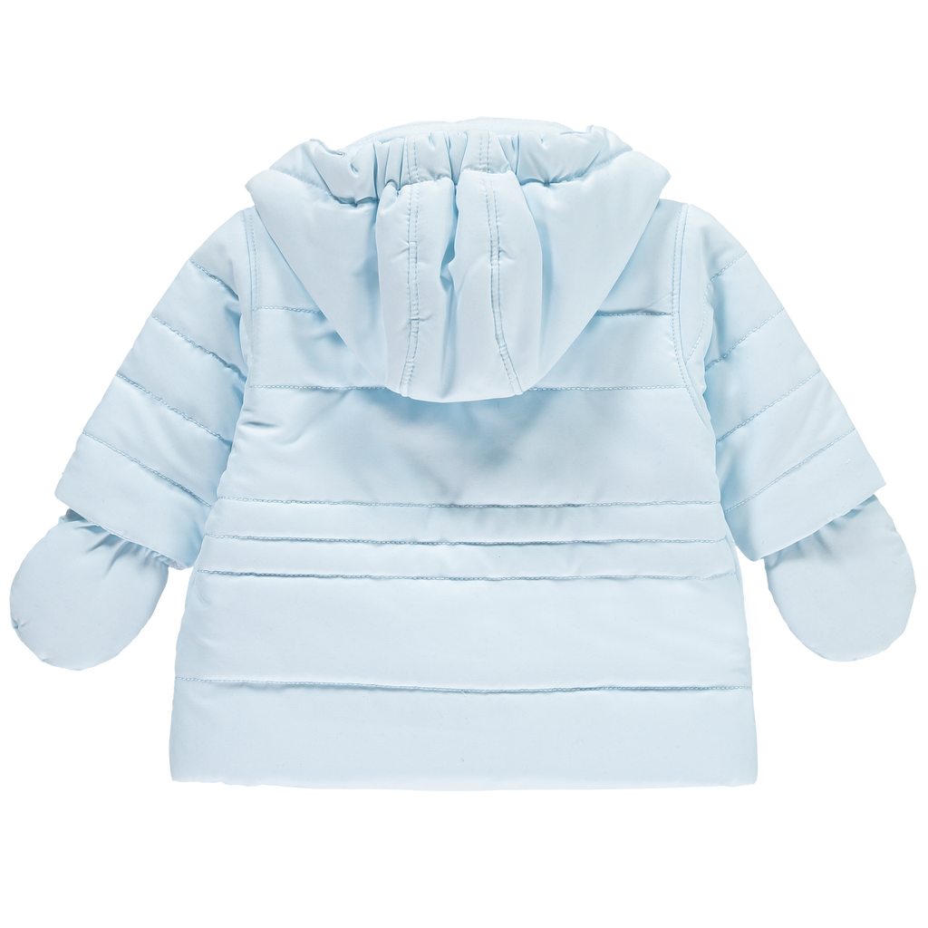 The Emile Et Rose Neil Jacket in blue microfibre offers practical protection with a detachable hood and mitts, allowing for adaptable comfort in changing weather. Crafted with attention to detail, this jacket ensures warmth and convenience for your child during outdoor activities.