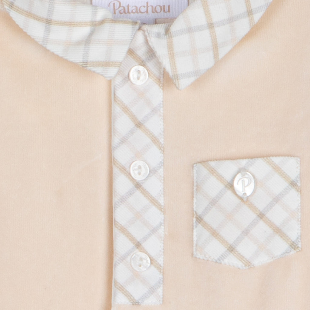 The Patachou Babygrow 33014 features a soft sand-colored fabric complemented by a classic check collar and matching detail, combining subtle elegance with cozy comfort. Designed with quality materials, this babygrow ensures gentle wear for delicate skin, making it an ideal choice for stylish and comfortable everyday babywear.