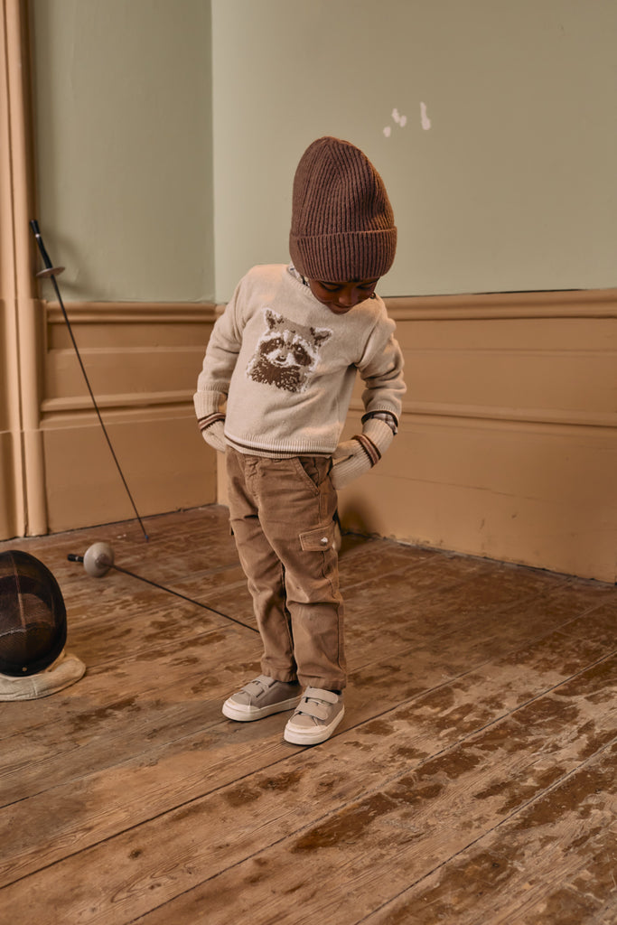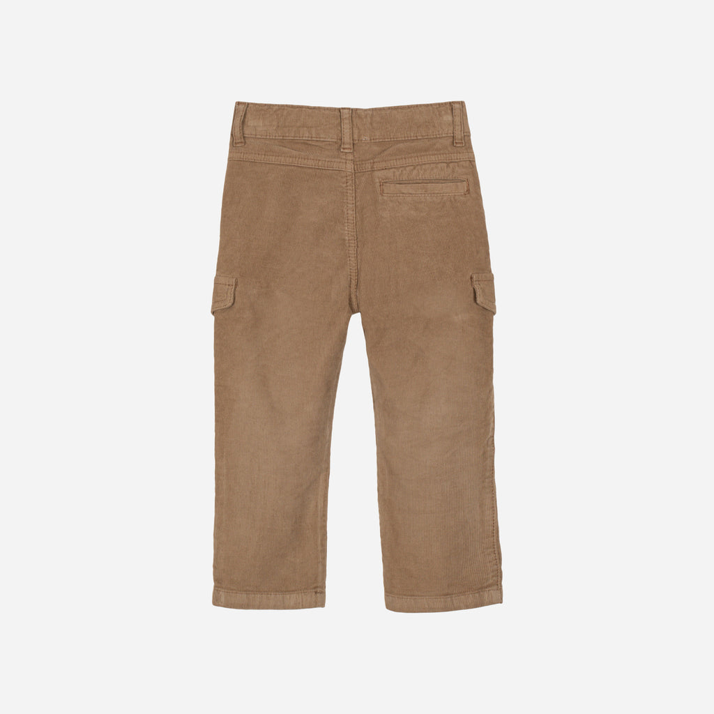 These brown Patachou Boys Trousers feature durable cord fabric designed for comfort and resilience. Equipped with practical combat-style pockets, they offer ample storage while adding a rugged, functional aesthetic. Ideal for active boys, these trousers blend style with utility for everyday wear.