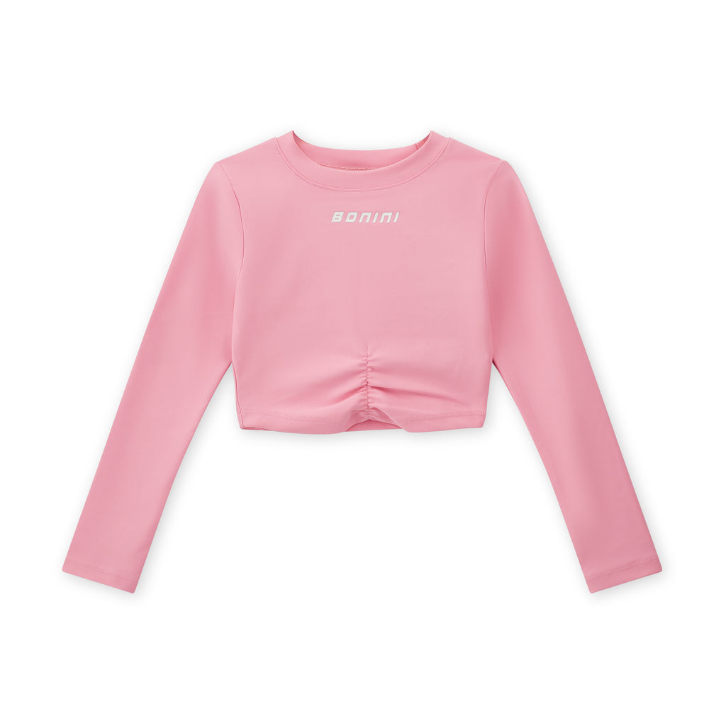 The Pink Bonini Aspire Sports Top 009 combines style and functionality with its printed artwork logo and thoughtfully designed ruched front detail. This long sleeve crop top offers a flattering fit that enhances your silhouette while providing comfortable coverage for active wear or casual outings. Its design emphasizes both aesthetic appeal and performance.