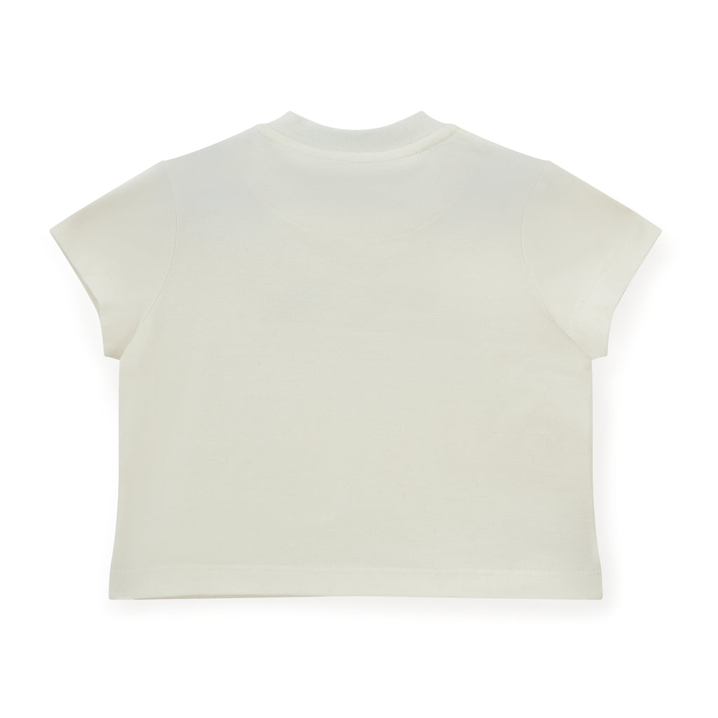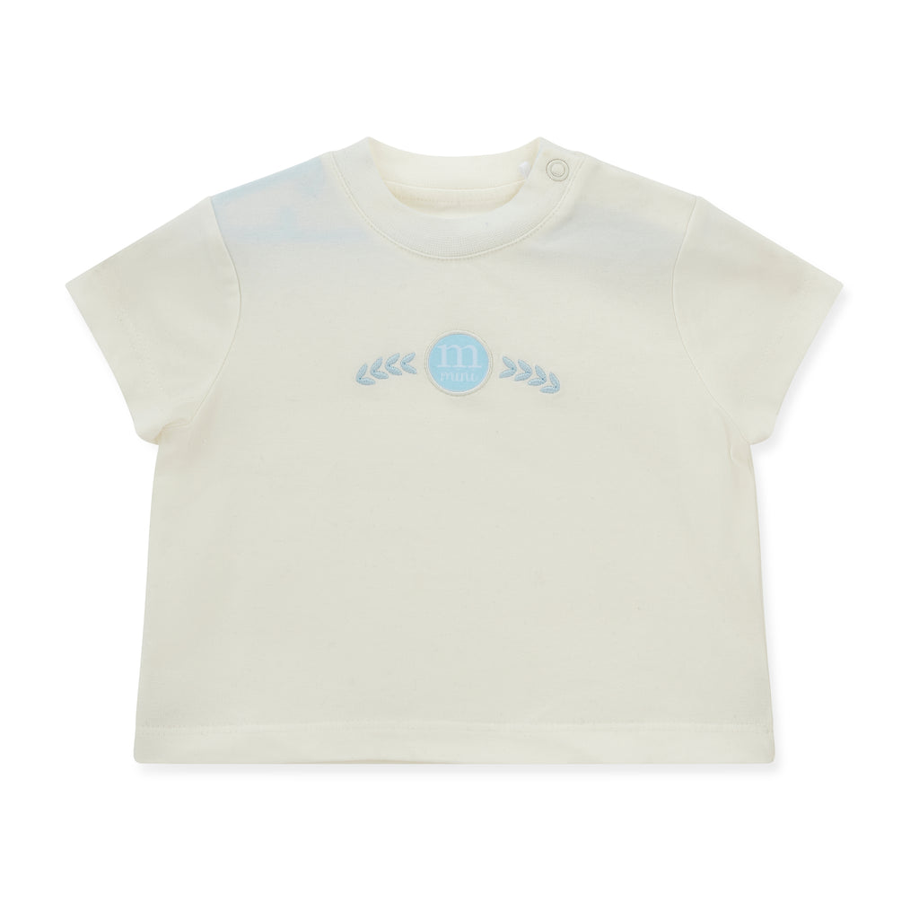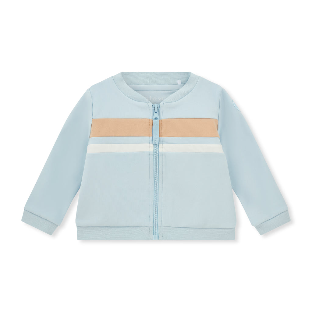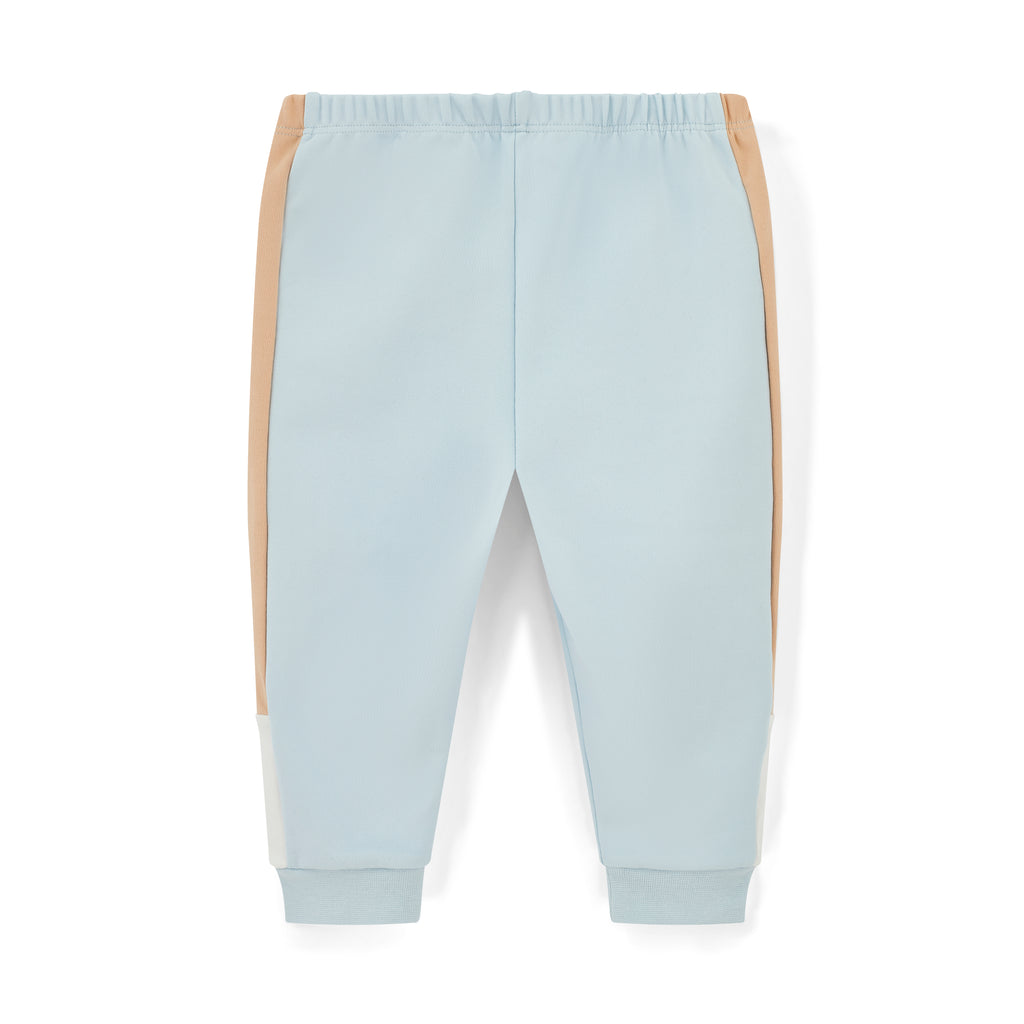 The mitch&son Miles Set offers a coordinated look with a zipper crewneck, joggers, and a white T-shirt. The crewneck features a beige and white panel stripe and a subtle sleeve logo, while the joggers include side block stripes and a contrasting logo on one leg. The crisp white T-shirt is finished with a blue front logo artwork, creating a balanced and stylish ensemble suitable for casual and refined wear.
