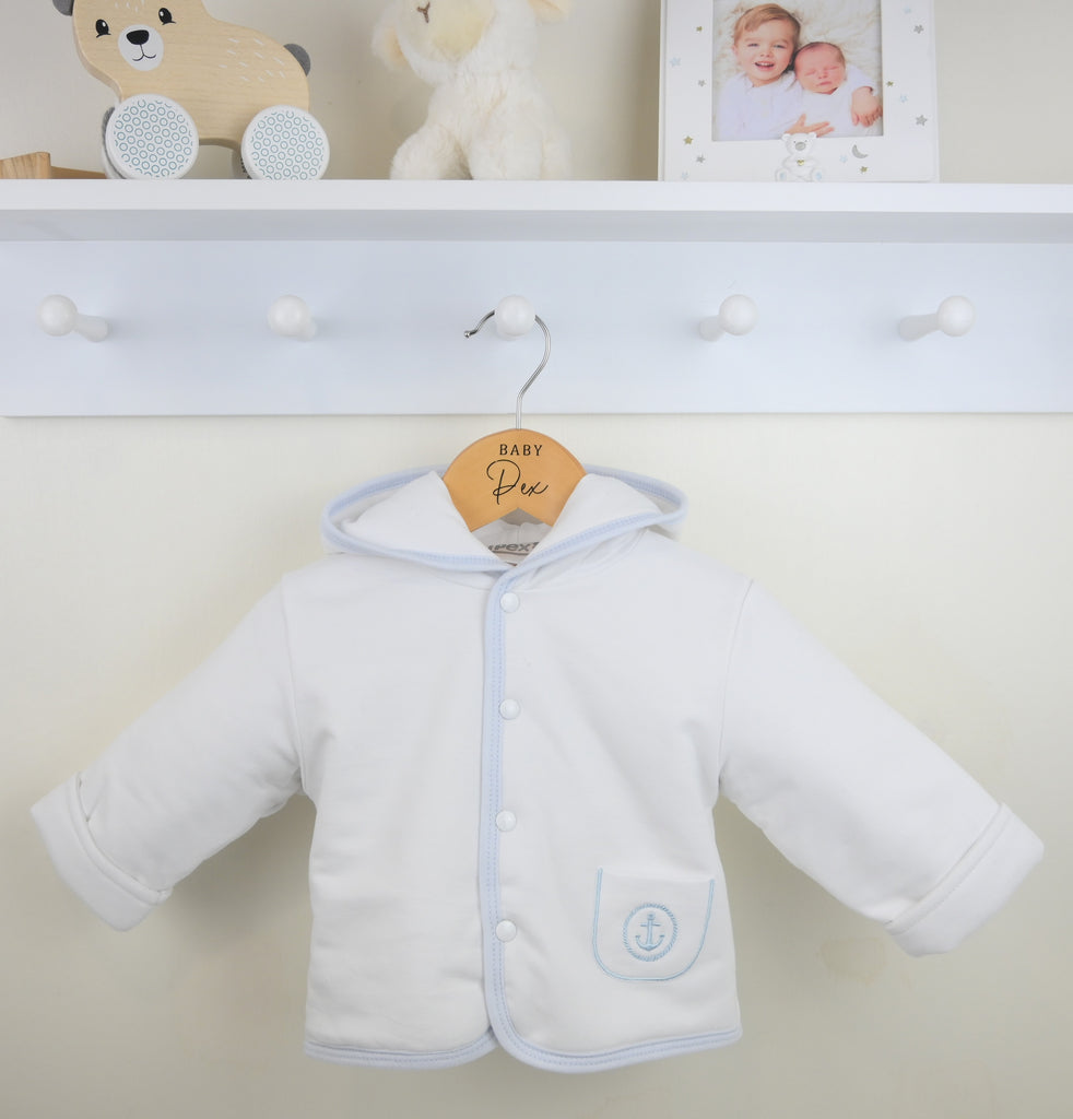 White Pex Sailor Jacket featuring distinctive anchor detailing and crisp blue trim. This classic nautical-inspired piece combines timeless style with practical construction, ideal for young sailors and maritime enthusiasts. The structured design ensures durability through active wear, while the contrasting blue accents add visual interest and authentic seaside charm. Perfect for both casual outings and themed occasions.