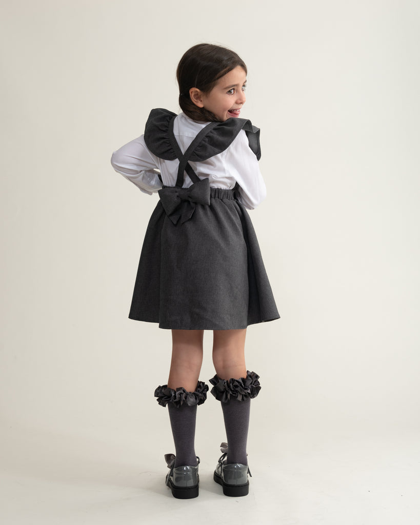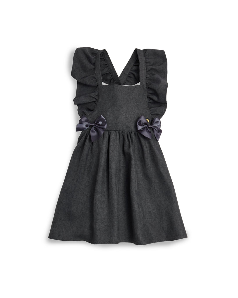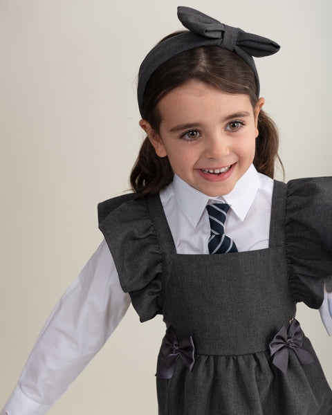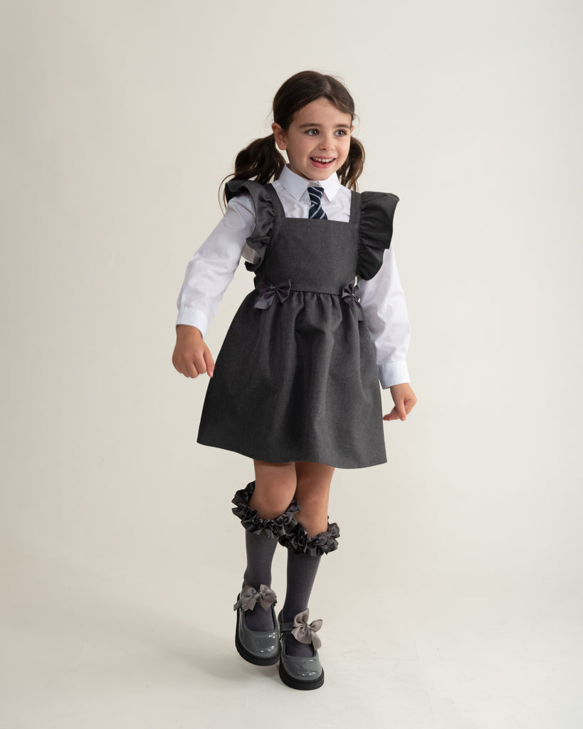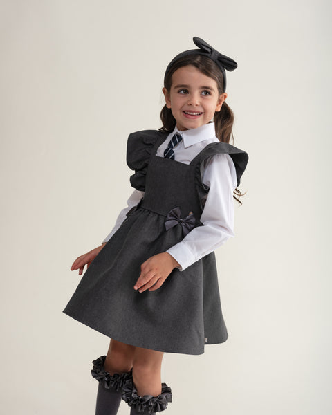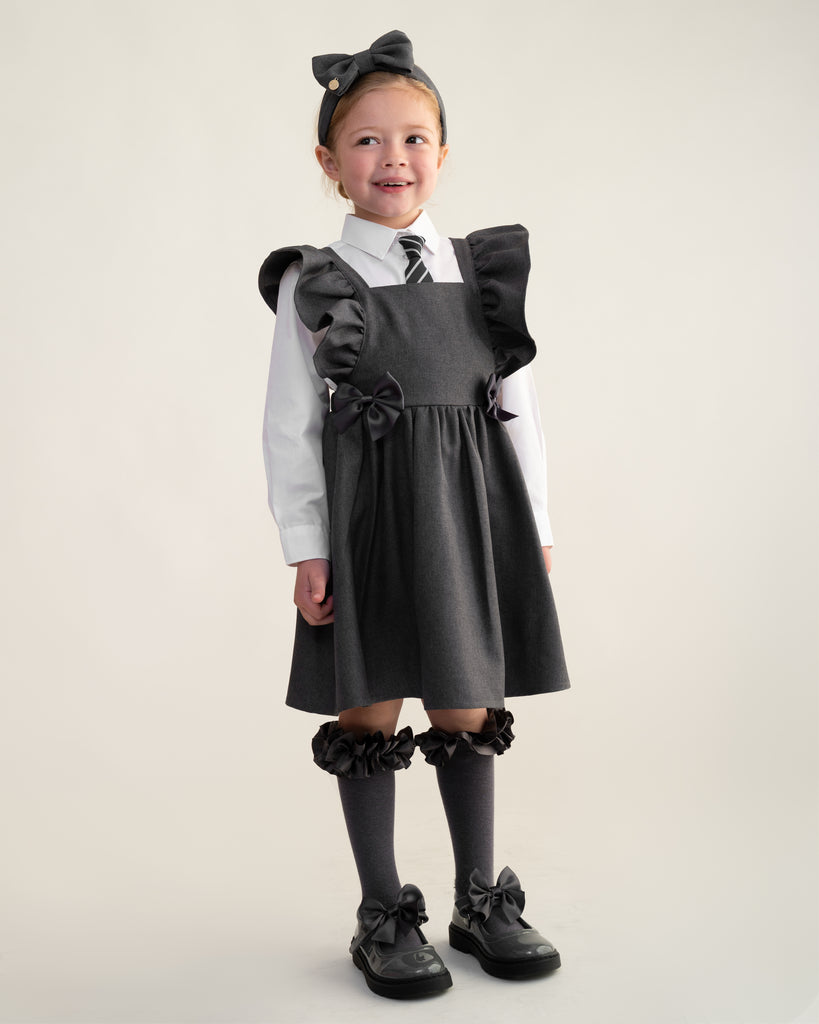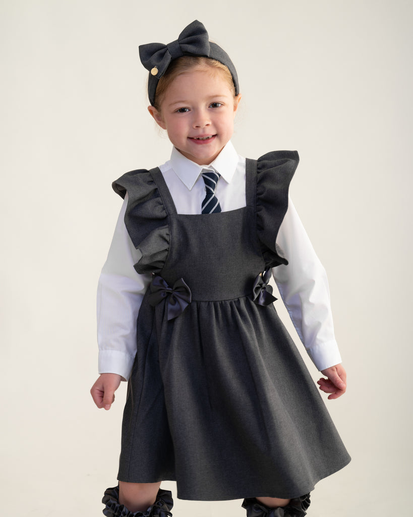 Introducing the Grey Caramelo School Pinafore, a refined and versatile addition to your school wardrobe. This flared pinafore features a charming bow detail, adding a touch of feminine charm to your look. Made with high-quality materials, this pinafore is both stylish and durable, perfect for all-day wear. Stay comfortable and chic with this must-have piece.
